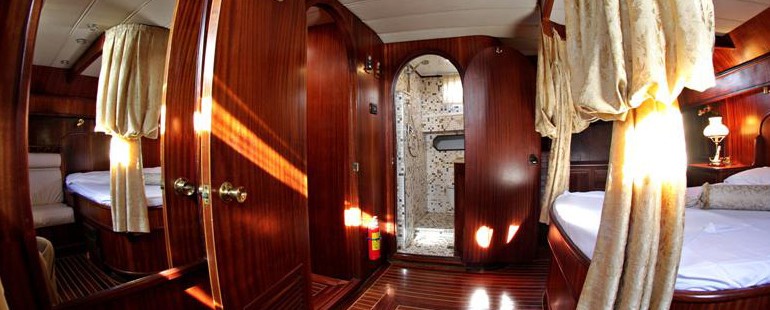 Below decks, gulet REX SICILIAE I offers 4 double en-suite cabins, each cabin has a single berth extra, idea for children if required. The master suite is aft and full beam of the yacht with a center lined double bed and sofa.