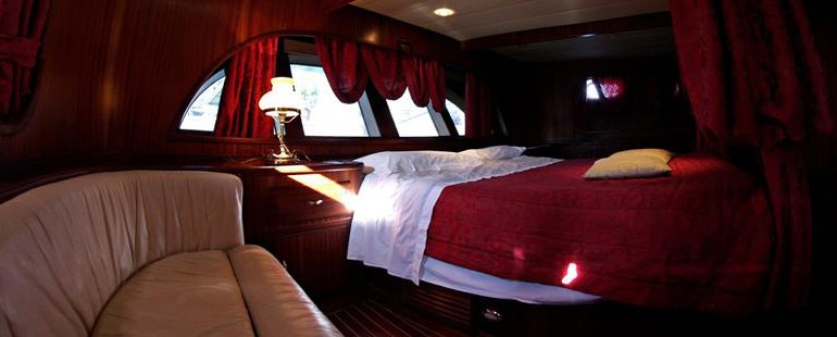 The master suite is aft and full beam of the yacht with a center lined double bed and sofa. The VIP cabin is forward and full beam of the yacht with a double bed and sofa. Two port and starboard cabins offer double beds. All 4 cabins are en-suite and feature an elegant traditional décor.