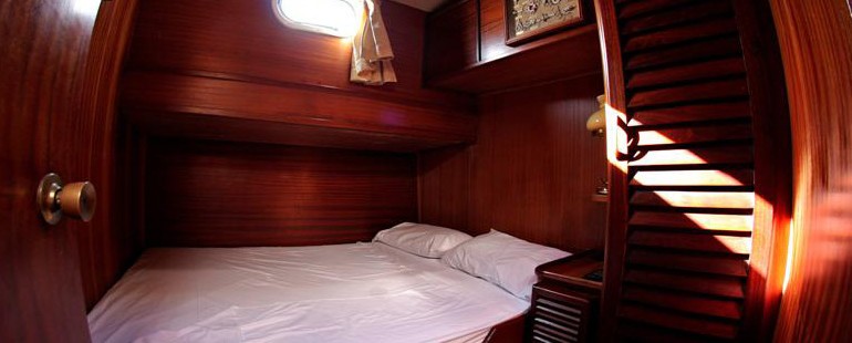 The master suite is aft and full beam of the yacht with a center lined double bed and sofa. The VIP cabin is forward and full beam of the yacht with a double bed and sofa. Two port and starboard cabins offer double beds. All 4 cabins are en-suite and feature an elegant traditional décor.