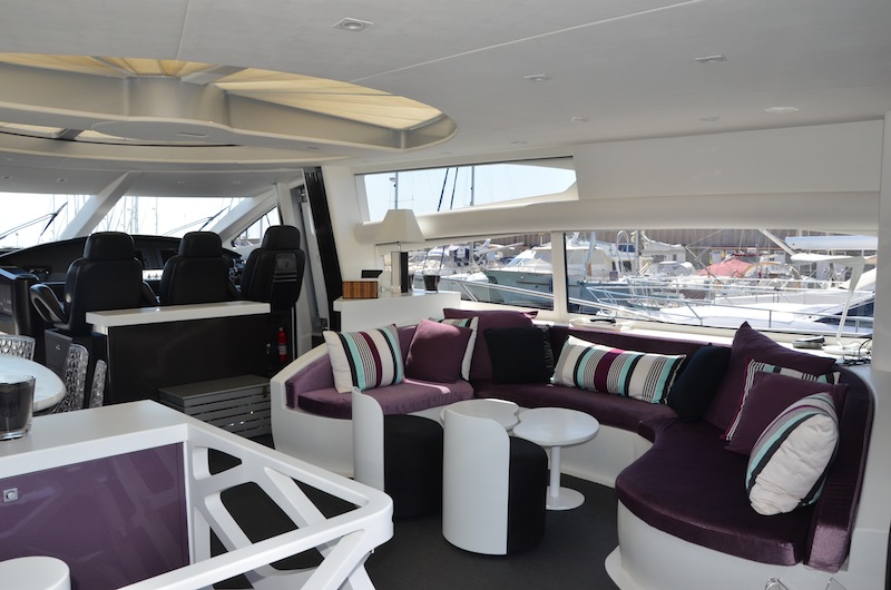 The salon and dining are an open plan with the lounge on the starboard side, a large U shaped sofa and coffee table invite guests to relax, on the port side is a casually elegant dining table. Panoramic windows offer ample natural light and uninterrupted views.