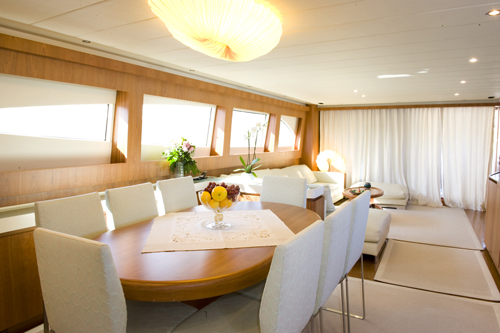 The salon and dining are an open plan with the lounge aft. On the starboard side a plush cream sofa and coffee table invite a relaxing atmosphere; on the port side guests may enjoy indoor entertainment from the retractable flat screen TV. Forward, the formal dining table can be casual or smart and seat 8 guests with ease.