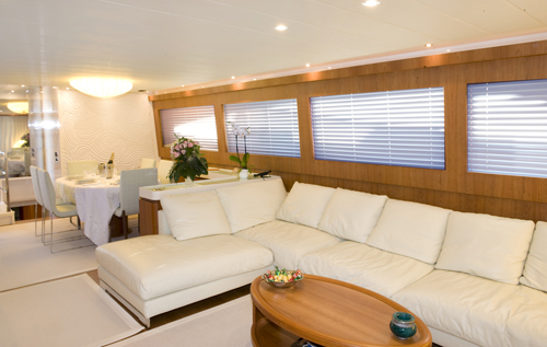The salon and dining are an open plan with the lounge aft. On the starboard side a plush cream sofa and coffee table invite a relaxing atmosphere; on the port side guests may enjoy indoor entertainment from the retractable flat screen TV. Forward, the formal dining table can be casual or smart and seat 8 guests with ease.