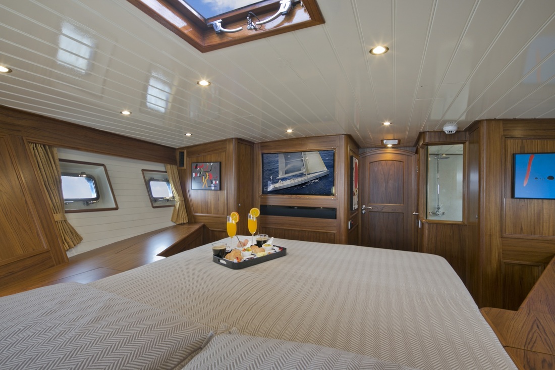 The master cabin is aft and full beam of the yacht with a center lined double bed, love seat and vanity. A further guest cabin is forward with 2 single beds. Both cabins offer lovely marble topped facilities and have full air conditioning.