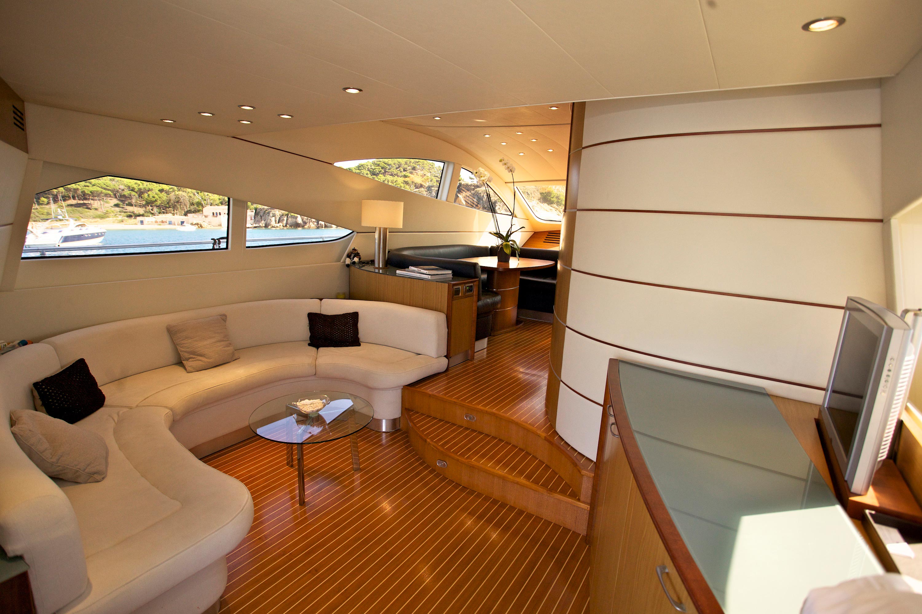 Her interior spaces are light and airy benefiting from ample widows and a minimalistic designs, the salon features traditional teak and holly laid floors, a plush cream leather sofa and entertainment system, forward the formal dining space is adjacent to the open plan galley.