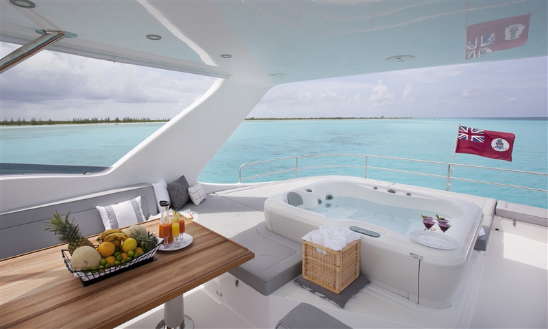 Luxury motor yacht FOREVER boasts a large flybridge complete with alfresco dining table and massive sunpads, ideal for entertaining by day or night.