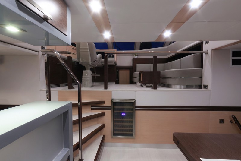 The salon and dining are on the starboard side with an open plan state of the art galley on the port side, forward of the salon and raised, is the helm station which offers further seating in a mezzanine style space.