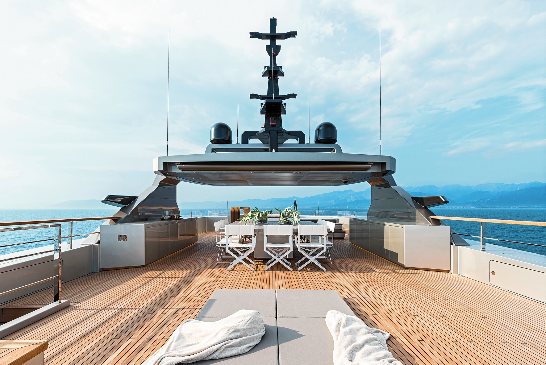 Exterior living is capacious on 3 levels. The main aft deck boasts ample seating and sunning space and is adjacent to the salon. An upper deck has an alfresco dining option, exterior lounge and sliding glass doors to the upper salon.
