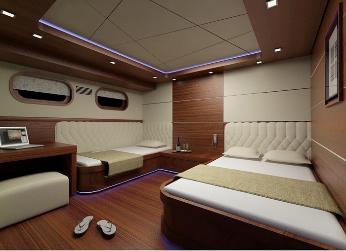 Forward of the aft master, are 2 mirror image twin cabins with side by side single beds and en-suite facilities. Further forward and aft of the fore master are 2 double cabins with double beds and en-suite facilities. Each cabin is generous and light offering deluxe accommodation and amenities.