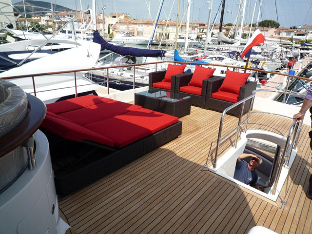 Motor yacht SILVER FOX has ample exterior deck areas, ideal for the Mediterranean climate. The aft deck is shaded and offers built in upholstered seating and an alfresco dining option. Wrap around decks lead to the large foredeck and chaise lounges.