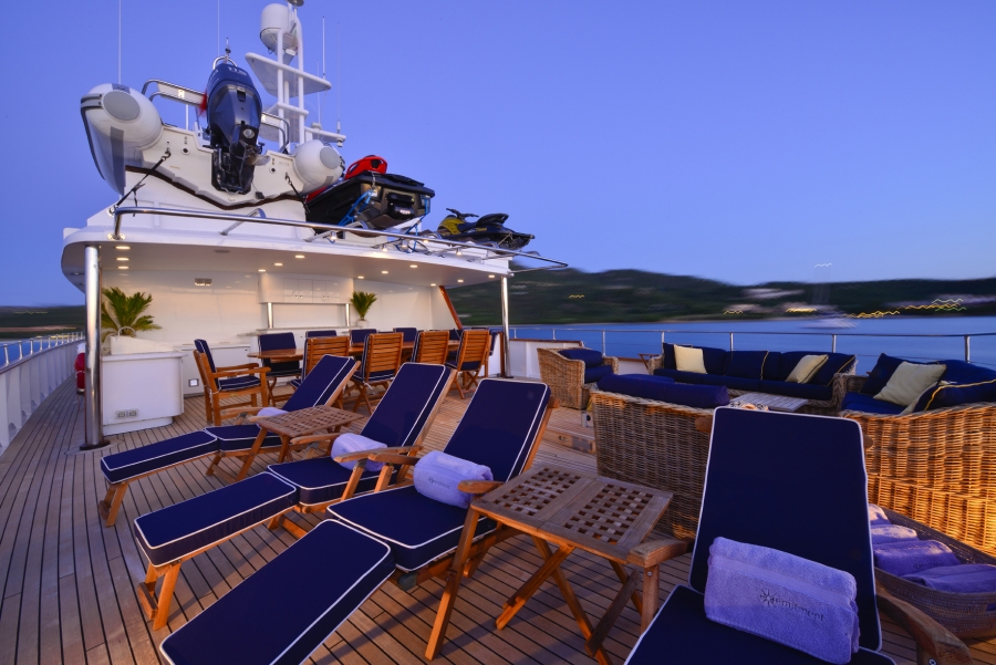 The Main saloon with dining for twelve and games area, the forward Breakfast area, and the Aft deck and boat deck which both also have dining facilities for twelve.
