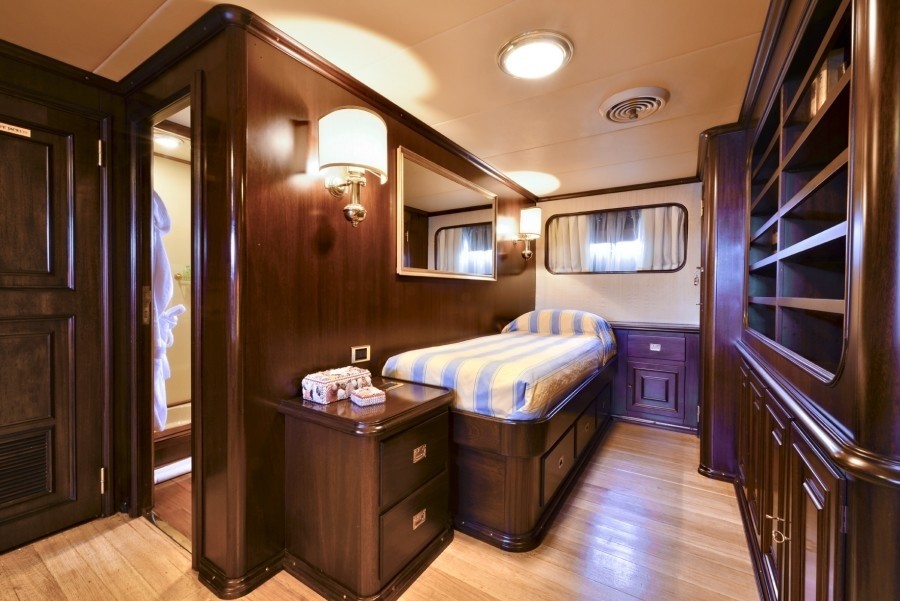 There are also two full-beam cabins on the lower deck with king-sized beds, one with en-suite bathroom and spa pool, the other with en-suite shower room. There is an option to have an extra single permanent bed by arrangement in this room. Finally, there are two twin-bedded cabins with en-suite shower rooms.