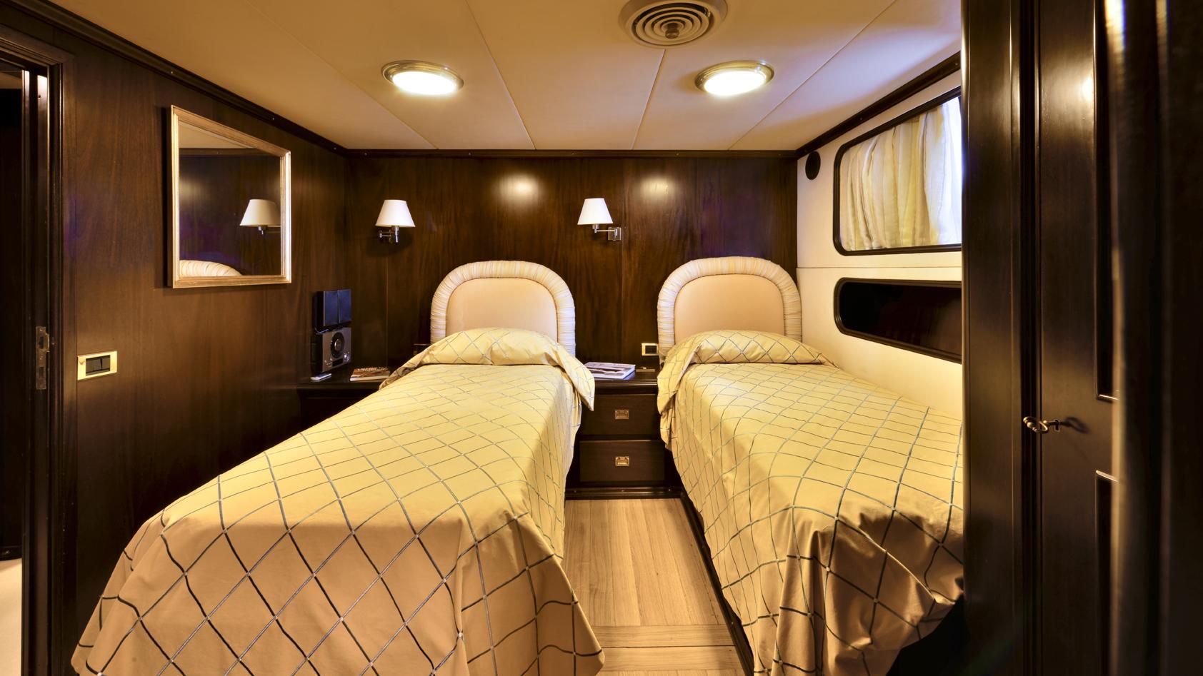 There are also two full-beam cabins on the lower deck with king-sized beds, one with en-suite bathroom and spa pool, the other with en-suite shower room. There is an option to have an extra single permanent bed by arrangement in this room. Finally, there are two twin-bedded cabins with en-suite shower rooms.