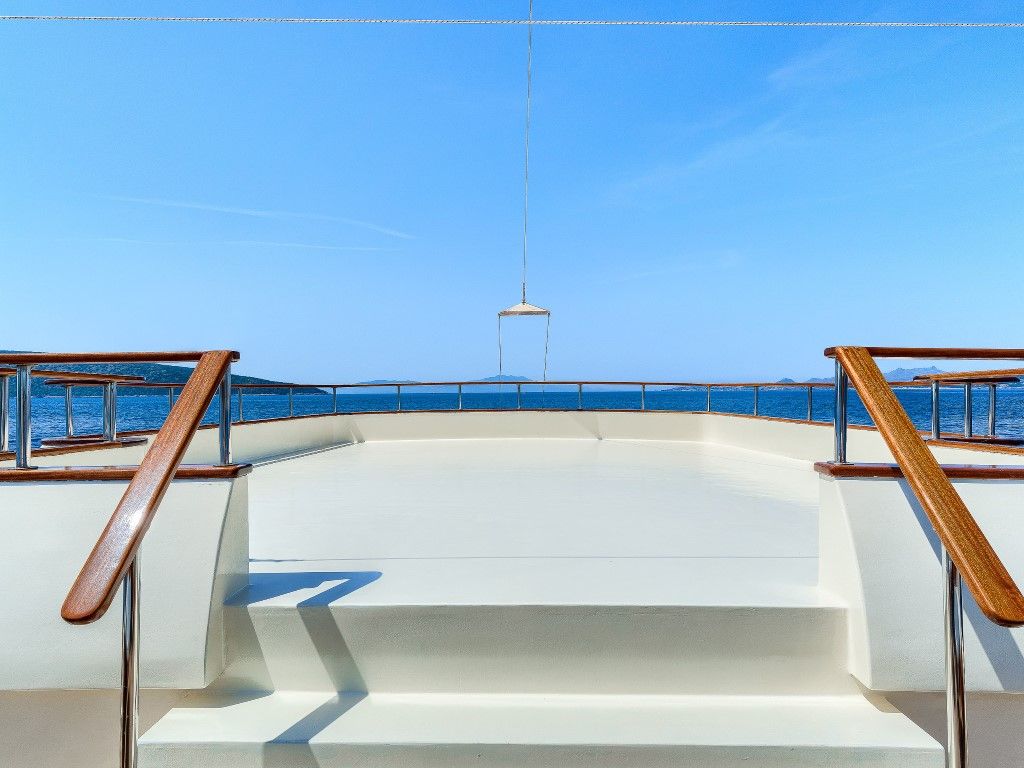 On deck, there is a formal dining area on the aft deck under a Bimini cover, here two tables seat all her 24 guests in comfort. Wrap around decks makes easy access to the large foredeck space. Above the main deck, the sundeck has ...