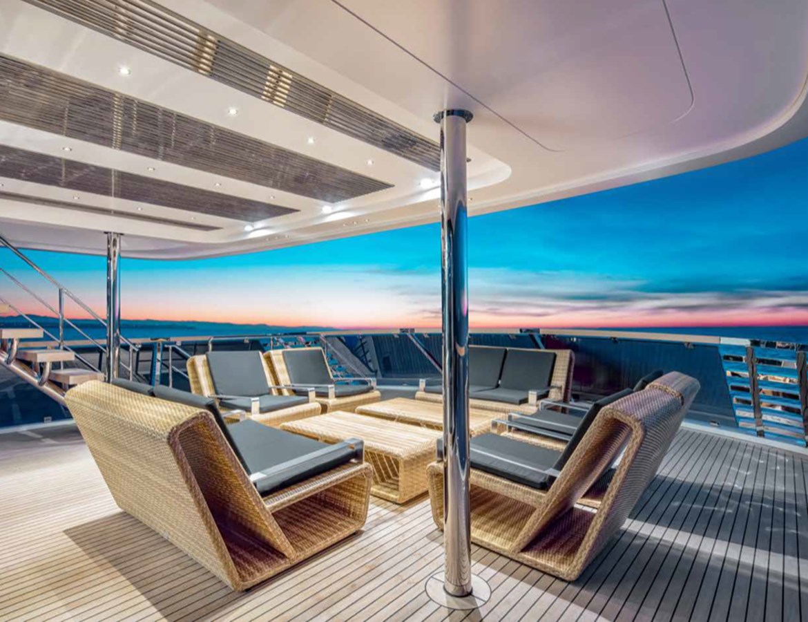The bridge deck has terraces both forward and aft: the foredeck offers a dining setting with u-shaped sofa seating, chairs and an adjustable table plus additional built-in seating and bimini shade; the aft deck is an al fresco lounge perfect for morning coffee or evening drinks.