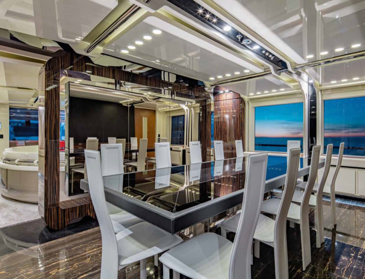 The bridge deck has terraces both forward and aft: the foredeck offers a dining setting with u-shaped sofa seating, chairs and an adjustable table plus additional built-in seating and bimini shade; the aft deck is an al fresco lounge perfect for morning coffee or evening drinks.