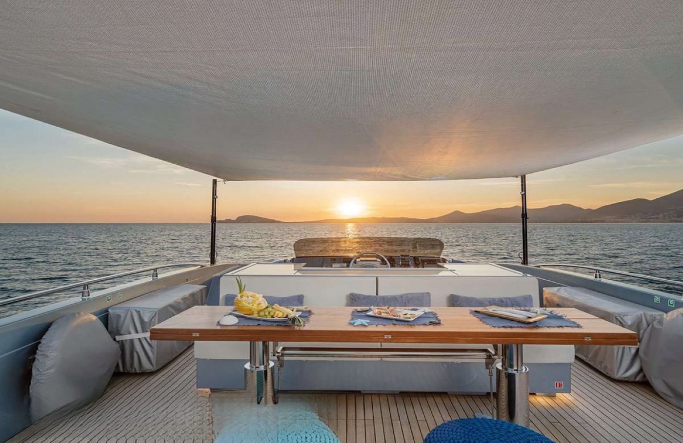 The main salon is spacious offering an L shaped sofa and occasional chairs in a cool grey tone, an island credenza offers a retractable TV and gives an elegant yet casual separation to the formal dining area forward. To starboard, a marble hall leads to the master cabin, which offers a king-size bed, private study and his and hers facilities.