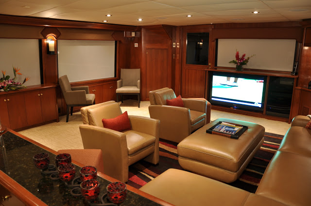 The salon and dining is an open plan with the lounge aft and the dining forward, a low island credenza creates an element of separation whilst still allowing a casual elegant ambiance. The lounge offers a full leather suite with large ottoman for ultimate relaxation, a flat screen TV ensures optimum entertainment.