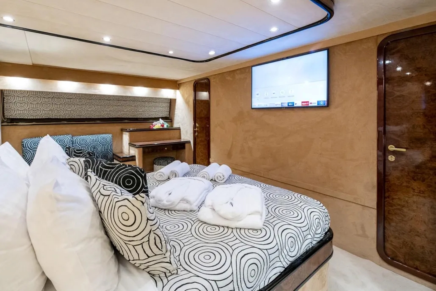 Forward of the master, on the starboard side, is the VIP cabin with a double bed. Further forward on port and starboard are 2 twin cabins with side by side single beds. Each cabin offers TV and music entertainment and boasts a deluxe décor.
