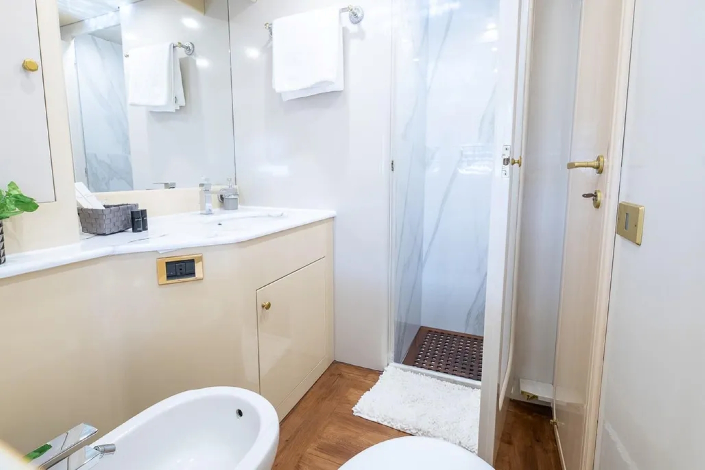 Forward, the formal dining are seats all 8 guests in comfort. There are panoramic windows from the salon and dining that allow for optimum natural light and unrivaled views.