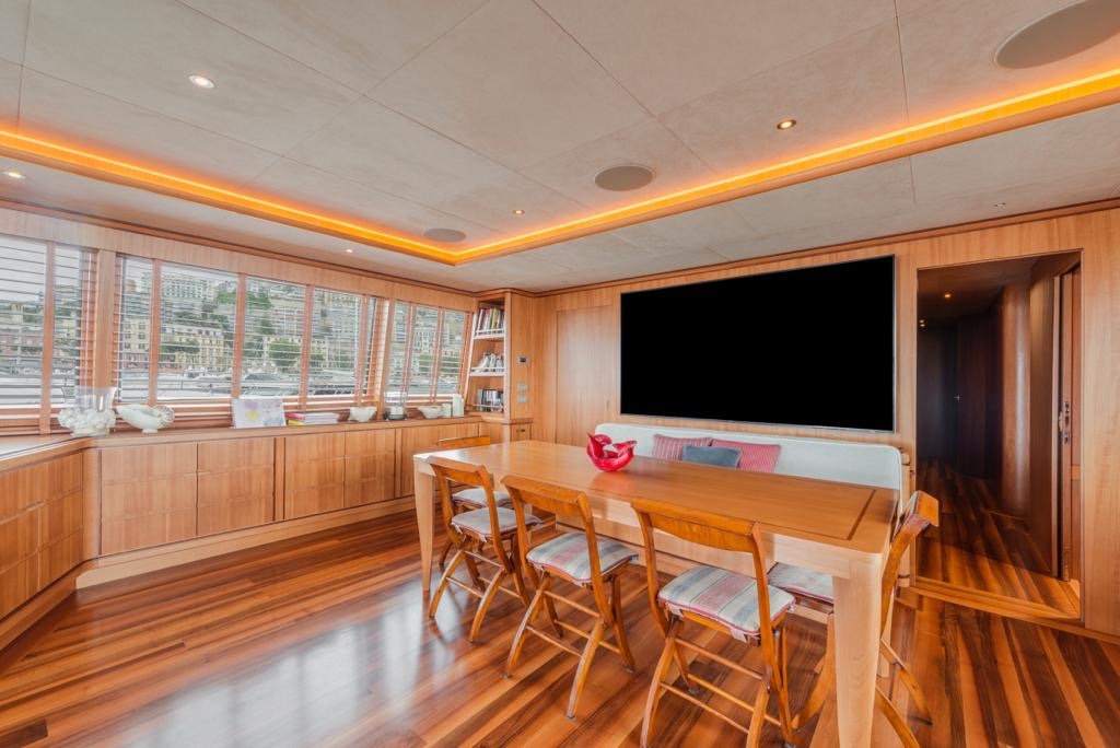 The main deck offers a large living room at the stern, in direct communication with the exterior, furnished with a dining table, a living room with two sofas and a fully stocked wet bar.
