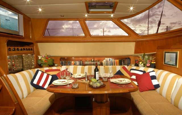 The salon has an open plan with a combined formal dining area, U shaped sofa, settee and full entertainment system. Guest accommodation is fore and aft of the salon in 2 double cabins. Thanks to the high cabin housing, the yacht ...