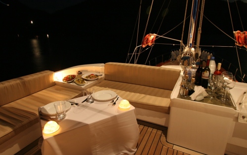 The aft deck offers an alfresco dining option and built in seating, Bimini shade makes it the ideal area for breakfast and lunch. Wide teak decks wrap around the yacht, on the foredeck the cabin house has numerous sunpads for all to enjoy.
