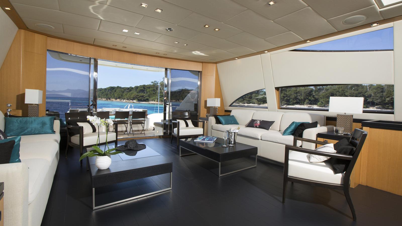 The salon and dining are an open plan adjacent to the aft deck, on the main deck level. Aft, the salon features 2 crisp white sofas, 4 occasional chairs and 2 coffee tables. Forward of the lounge, is the formal dining area. A chic and modern décor boasts dark wood floors and light panels, creating a contemporary and clean atmosphere.