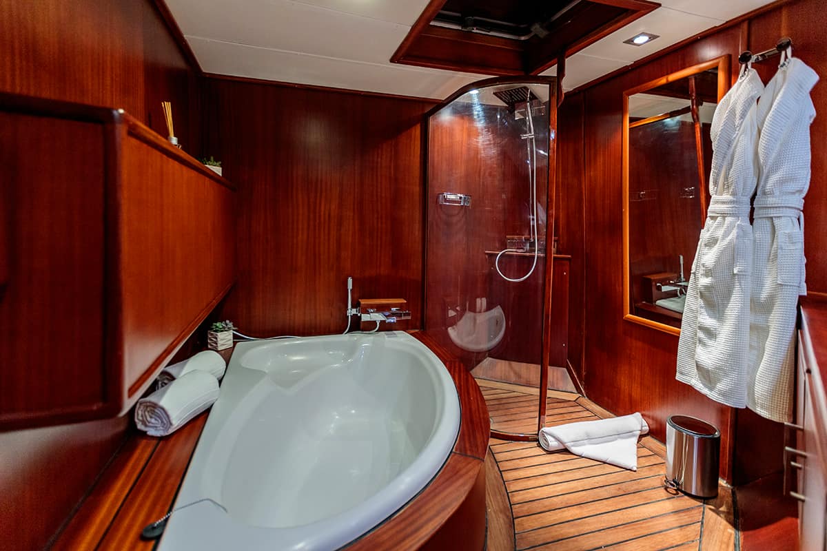 The decks wrap around the yacht 360°, on the foredeck is a further alfresco dining option, ideal for light meals and cocktails. Atop the cabin house, there are plenty of plush sunpads for all to enjoy.