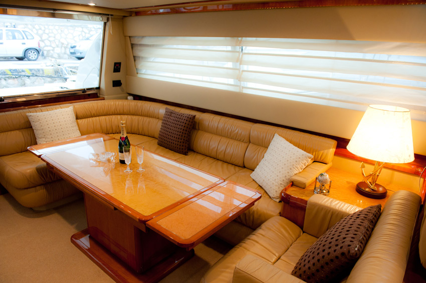The salon offers a large sofa, formal dining table, occasional chairs, opposing smaller sofa, bar area and full entertainment systems, all surrounding by elongated side windows for optimum natural light. Forward is the helm main station and a further seating area.