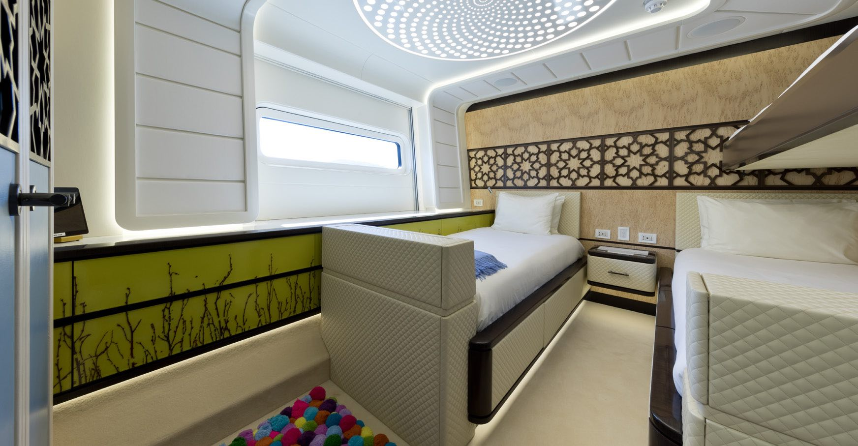 NOTABLE FEATURES OF KHALILA: ~ Imposing golden-coloured hull and superstructure ~ sporty & dynamic looks ~ 'matching' tender ~ clean modern interiors with fabulous use of ...