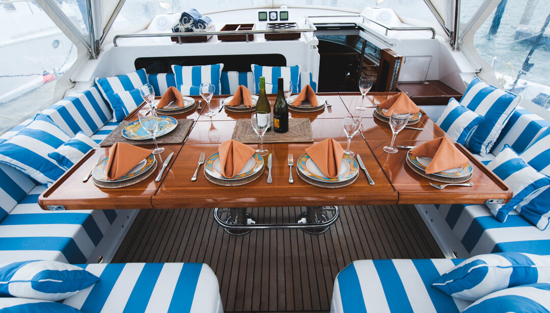 Concerto’s raised pilothouse offers an upper saloon overlooking a lower dining area. This configuration is complemented by full view wrap-around windows offering plenty of air and light.