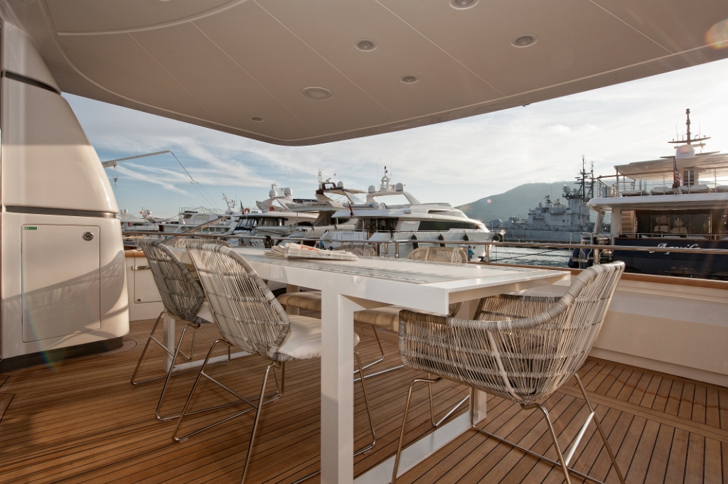 The aft deck is shaded and boasts an alfresco dining option, further aft the full beam extended swim platform makes water access effortless. Guests wishing for a little privacy will find the double sunpad on the foredeck ideal for a quite escape.