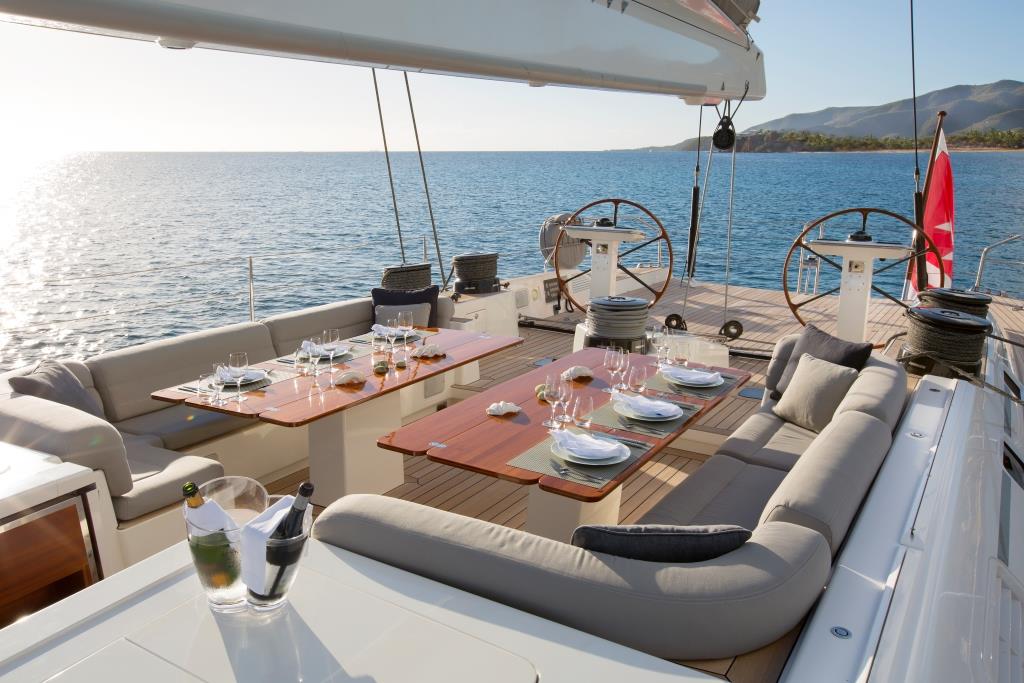 From the salon, a companionway leads to a large guest cockpit, 2 alfresco dining tables with a walk through space and optional Bimini cover. The dual helms are aft of the cockpit, ensuring guests a relaxing uninterrupted experience.