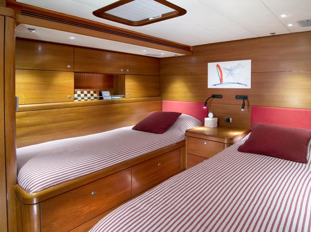 The yacht boasts elegant and graceful lines and offers accommodation for up to 6 charter guests in 3 deluxe cabins and is an ideal choice for families, friends and the distinguished sailor.