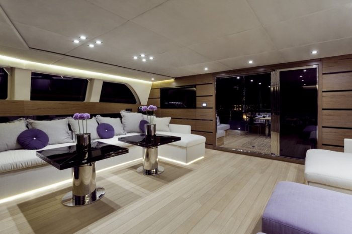 The salon offers a contemporary ambiance with opposing sofas, tables and ottomans. Surrounding 180° windows and aft facing sliding doors ensure the space is light and airy. With direct access the aft deck, the salon is an excellent social area.