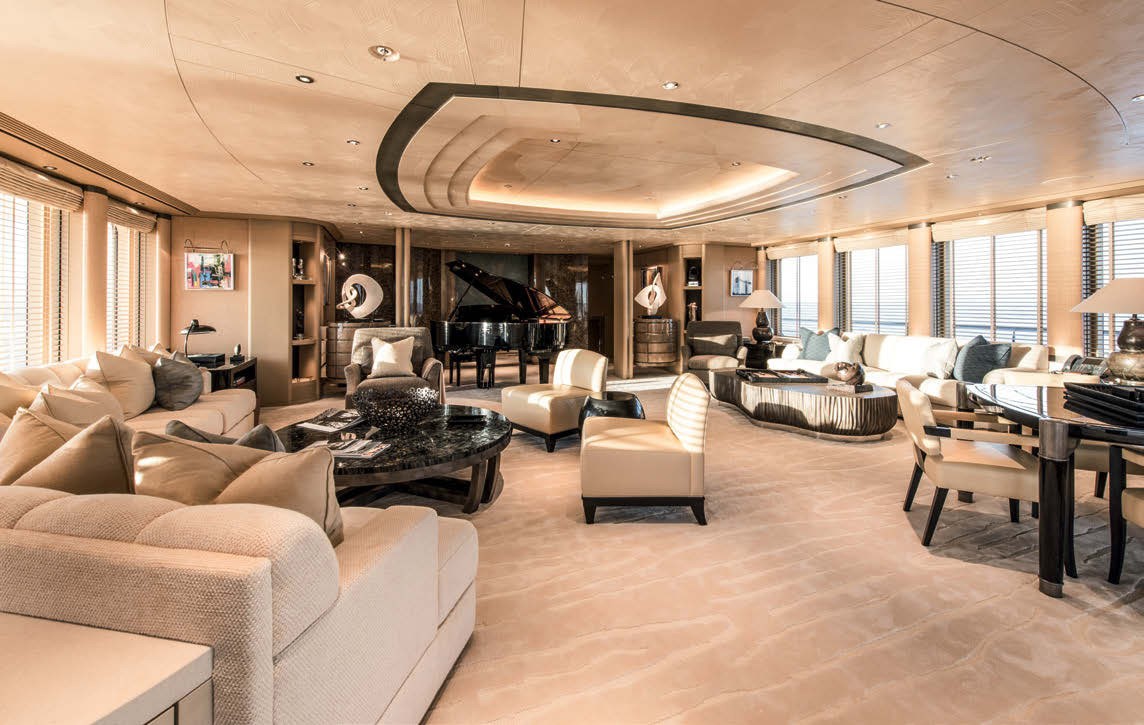 Above, the bridge deck layout has a forward helm station and an aft beauty salon as well as a workout room with massage tables for post-workout relaxation.
