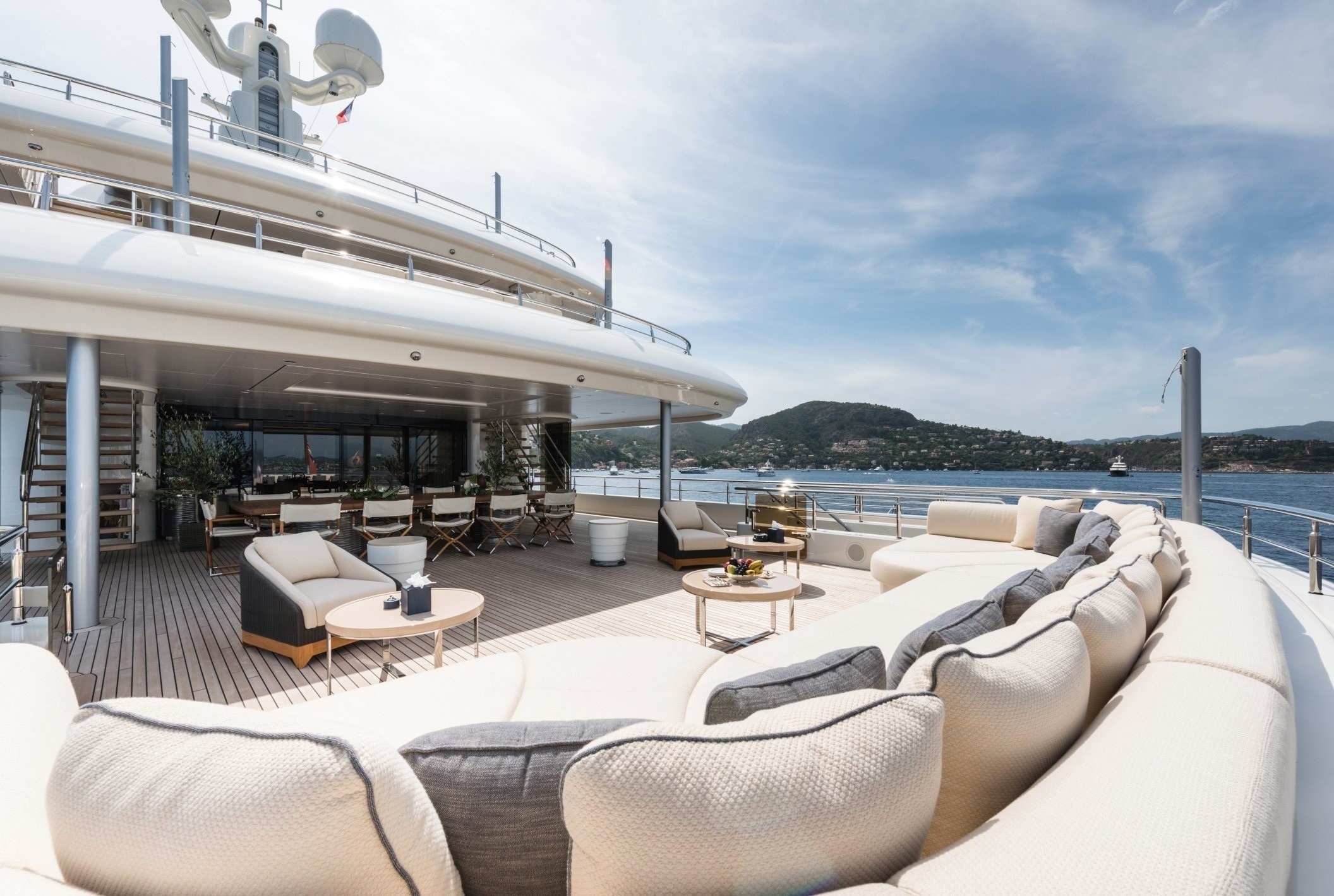 The sun-exposed bridge deck aft is fitted with sunpads and a generous outdoor lounge which acts both as an additional sunbathing area and as a comfortable nighttime cinema for films under the stars.