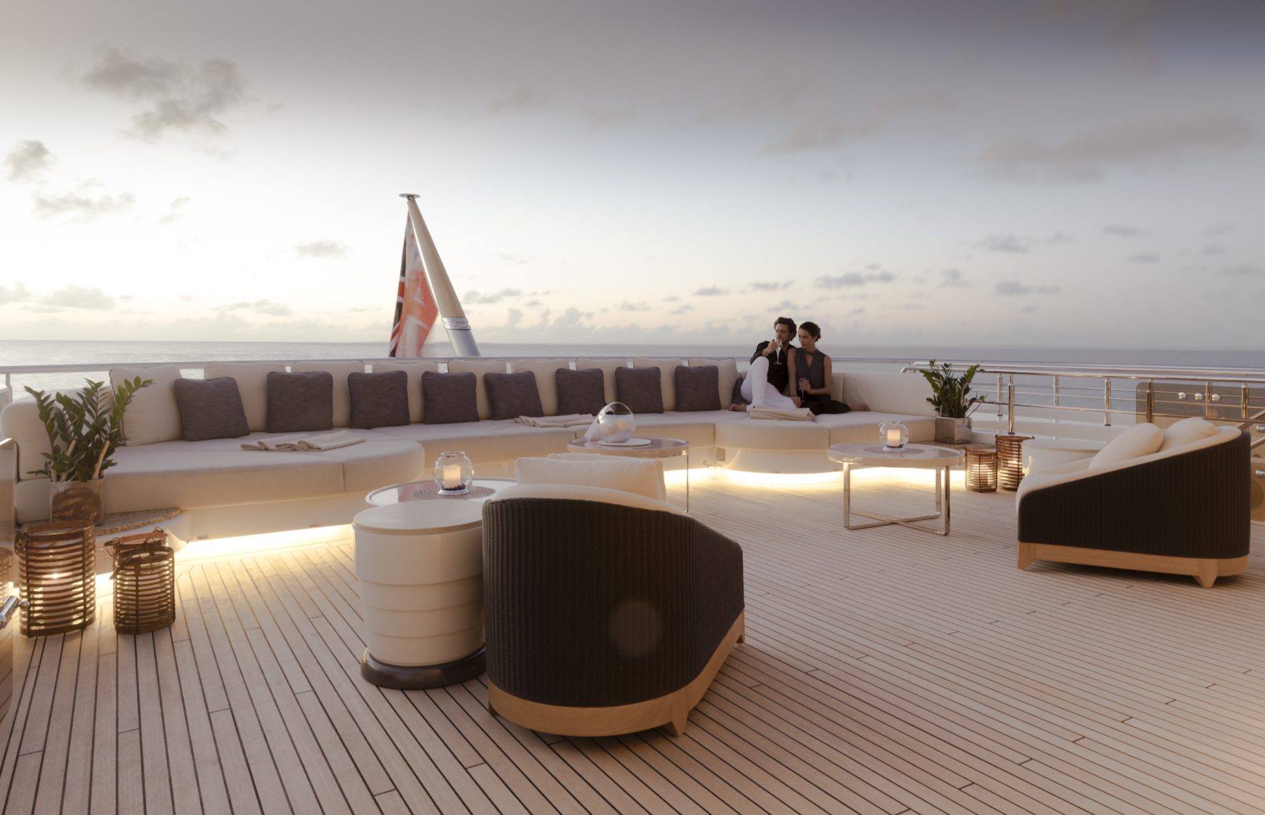 Guests can savor a sunset cocktail on the seating along the stern, which consists of a padded sofa and two tables each with four chairs. On the bow, a Portuguese deck provides a secluded forward seat and sunloungers for unwinding in the sunshine with sweeping forward views.