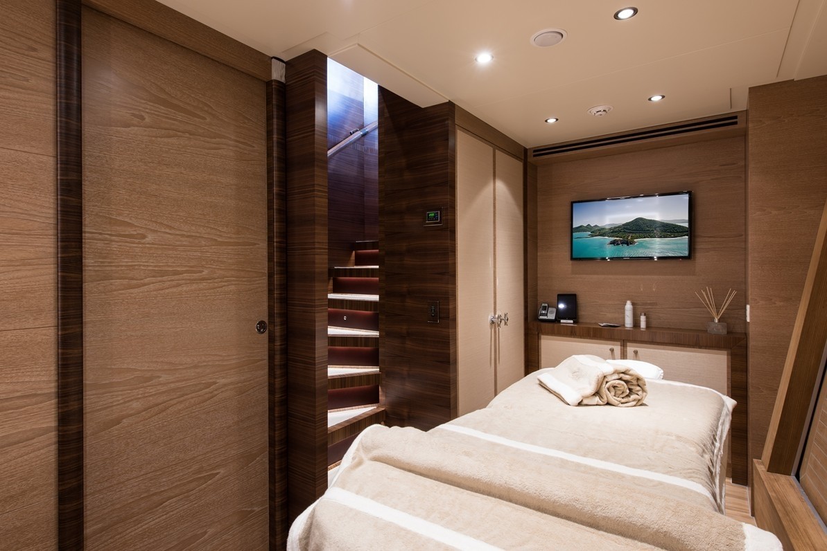 This motor yacht provides extensive outdoor spaces, a huge sundeck, as well as a cozy beach area, with a generous swimming platform. Guests can relax on the vast sun pads or have a drink at the bar and enjoy dining alfresco.