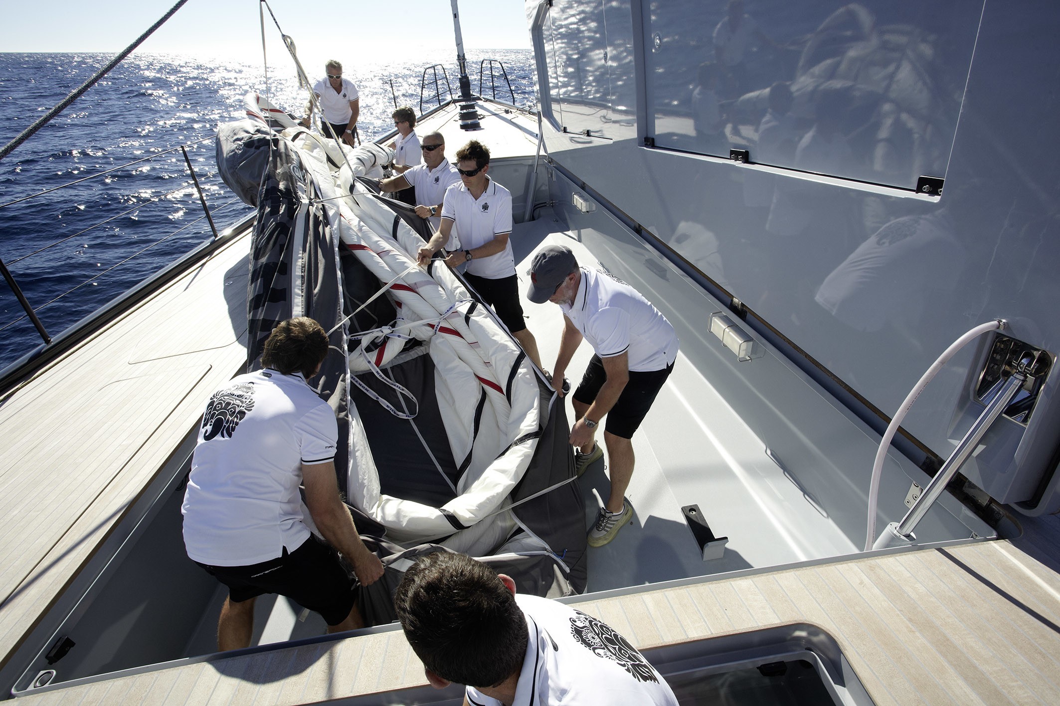 The main deck aft boasts dual helms and capacious deck area, while forward, the flush hatches and decks allow guests and crew to move fore and aft easily and safely.
