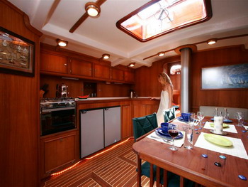The salon is spacious offering a generous settee and formal dining area on the starboard side, with the galley space on the port side. A navigation station is raised in the dog house, with additional seating and idyllic views.