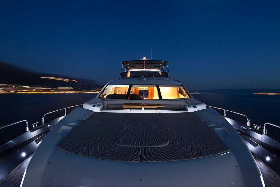 The foredeck boasts a triple sunpad, ideal for the sun worshipers in the group. Additional entertaining is on the flybridge, where sunning, seating and option shade is available.