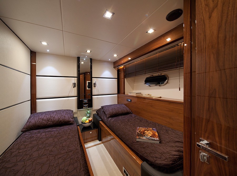 Motor yacht IMAI is equipped with TRAC at anchor stabilizers. The IMAI motor yacht can accommodate up to 8 charter guests in 4 en-suite cabins, each cabin has an elegant décor with quality high gloss wood panels, leather detailing and features audio and visual entertainment.