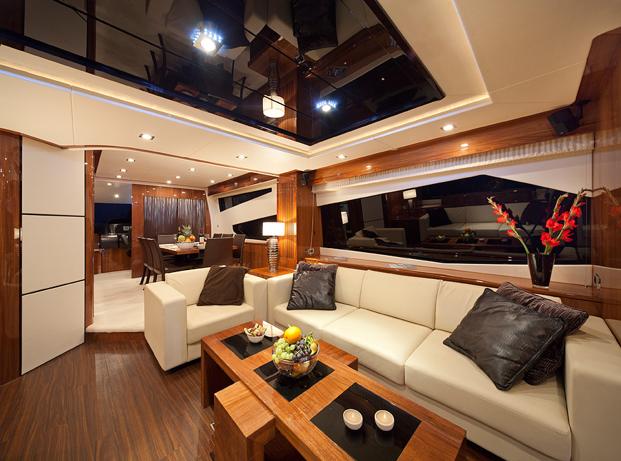 The salon is ideal for socializing, with 2 large plush leather sofas, occasional chair, custom coffee table and full entertainment system. Forward of the salon the formal dining table seats guests in a stylish setting.