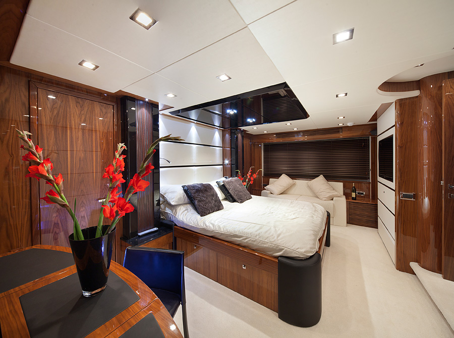 The IMAI motor yacht can accommodate up to 8 charter guests in 4 en-suite cabins, each cabin has an elegant décor with quality high gloss wood panels, leather detailing and features audio and visual entertainment. The master suite is amidships and full beam of the yacht with a center lined queen size bed, sofa and vanity.