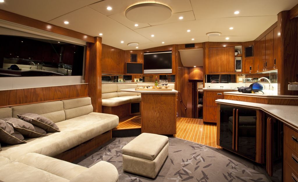Forward of the salon, on the port side is the country style galley with additional seating and casual dining. On the starboard side, a separate formal marble dining table enjoys privacy and idyllic views.