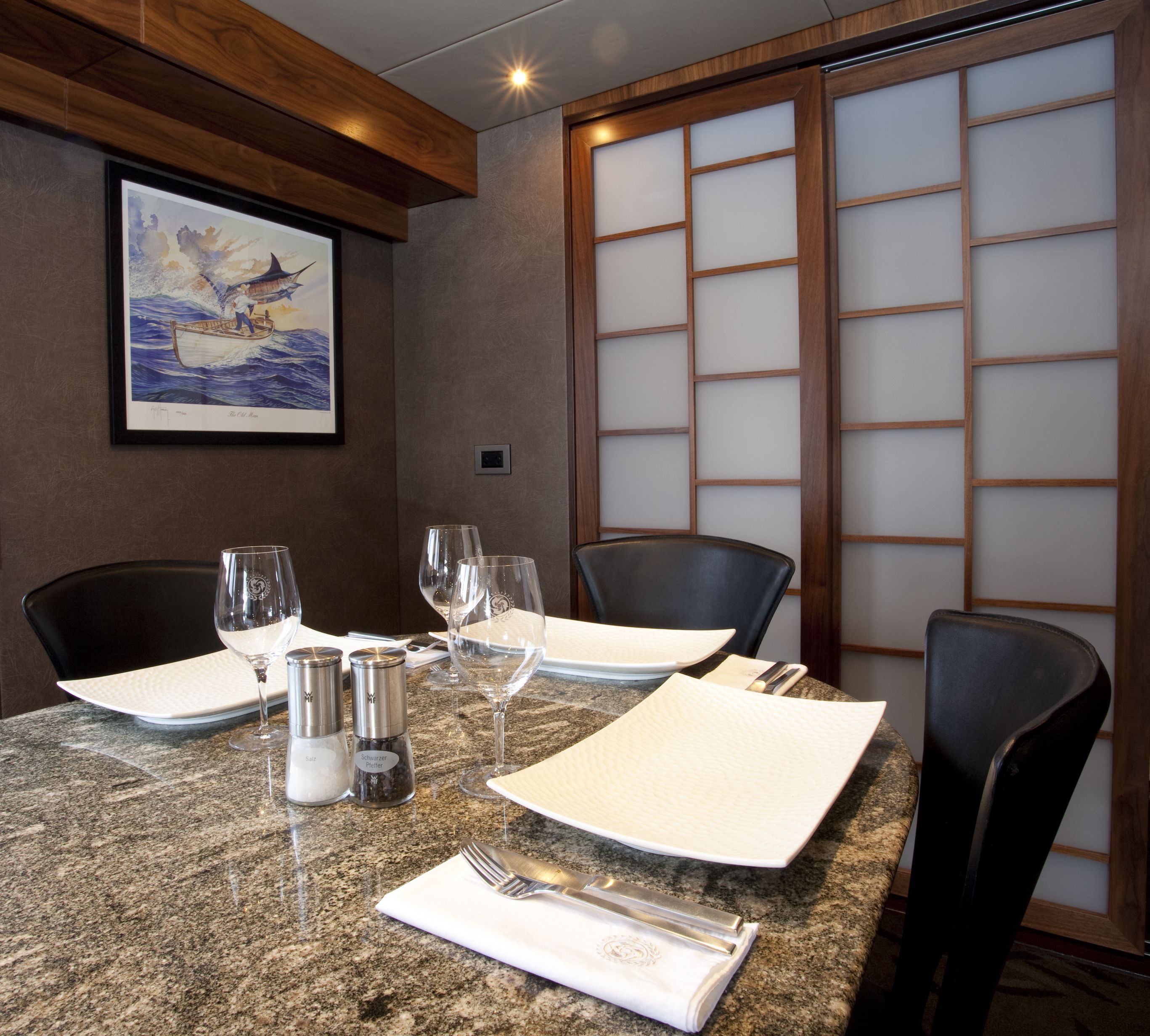 Forward of the salon, on the port side is the country style galley with additional seating and casual dining. On the starboard side, a separate formal marble dining table enjoys privacy and idyllic views.