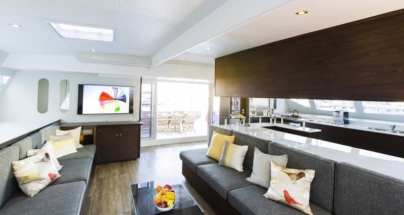 The salon and galley are an open plan on deck level, allowing for 360° views, ample light and an extremely social focus. Wide sliding glass doors open out onto the shaded aft deck, complete with alfresco dining option, ample seating and 2 double sunpads.