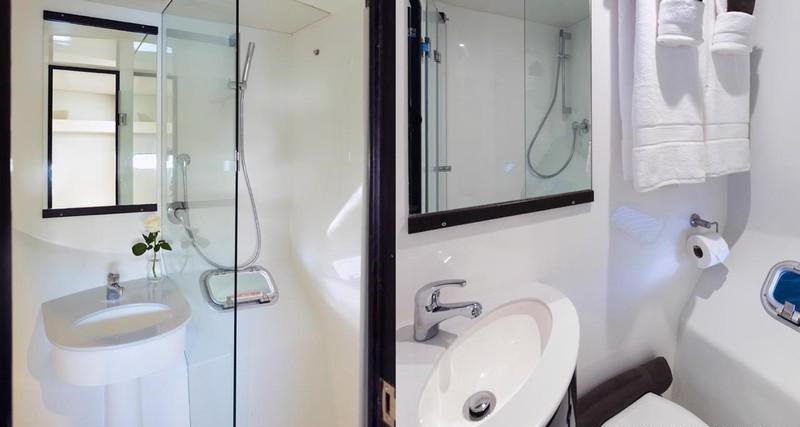 Above the main deck, the flybridge is generous offering loads of sunning areas, optional shade, seating and a mini hot tub. Charter yacht TRANQUILITY offers 6 en-suite cabins for up to 12 charter guests. The port hull has the master suite forward, with a queen size bed and ample floor space. A VIP cabin is aft with a queen size bed.