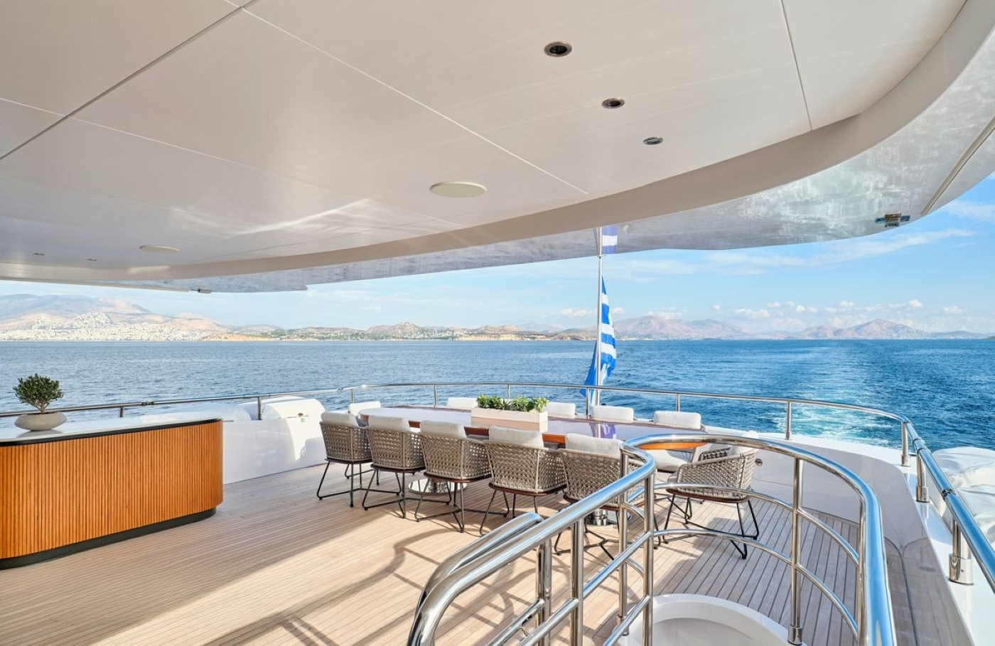 The C-shaped stern sofa fits around a stylish coffee table and before the glass doors leading into the main salon there are a couple of armchairs resting on top of a plush outdoor rug.